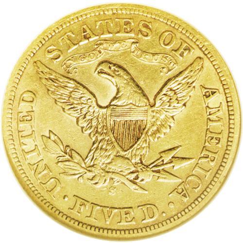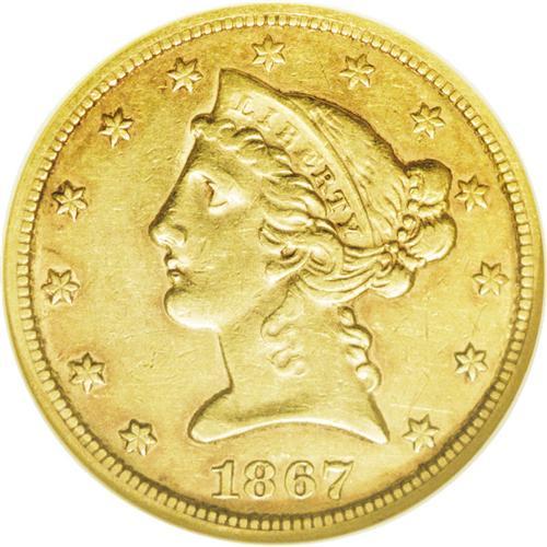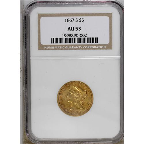 <B>1867-S $5 AU53 NGC.</B></I> This early Motto S-mint issue has a small mintage of 29,000 pieces, few of which were set aside, or held for long as bank reserves. Neither NGC nor PCGS has certified any as Mint State, and even Bill Gates would have settle for an AU like everyone else. The present orange-gold representative is suitably struck, and only a pinscratch on the left obverse field bears mention. Census: 8 in 53, 10 finer (9/06).<BR><BR><b>Shipping:</b> Coin/Currency (<a target="_blank" href="http://www.heritageauctions.com/common/shipping.php">view shipping information</a>)