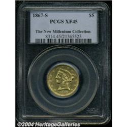 <table><tbody><tr><td><table> <TR><TD width="100%"><TABLE cellSpacing=1 cellPadding=3 width="100%" border=0><TBODY><TR><TD width="100%" bgColor=#79735c><FONT face=arial color=#ffffff size=3><B>Description</B> </FONT></TD></TR><TR><TD width="100%" bgColor=#ffffff><FONT face=arial size=2><B>1867-S $5 XF45 PCGS.</B></I> The 1867-S Half Eagle, an underappreciated S-mint issue from a mintage of 29,000 coins, is generally seen in heavily worn condition. This still-lustrous example is reasonably sharp in the centers and shows the normal concentration of abrasions in the fields.<BR><I>From The New Millennium Collection, Part 3.</B></I> </FONT></TD></TR></TBODY></TABLE></TD></TR></TBODY></TABLE><BR><A name=PricesRealized></A><TABLE cellSpacing=0 cellPadding=0 width="100%" bgColor=#000000 border=0><TBODY><TR><TD width="100%"><TABLE cellSpacing=1 cellPadding=3 width="100%" border=0><TBODY><TR><TD width="100%" bgColor=#79735c><A name=PR><FONT face=arial color=#ffffff size=3><B>Previous Prices from Heritage Auctions</B> </FONT></A></TD></TR><TR><TD bgColor=#f6f6ed><TABLE cellSpacing=0 cellPadding=0 width="100%" border=1><TBODY><TR><TD align=middle width="33%"><B>Date</B></TD><TD align=middle width="33%"><B>Service</B></TD><TD align=middle width="33%"><B>Price</B></TD></TR><TR bgColor=whitesmoke><TD width="33%"><B>03/13/1999</B></TD><TD width="33%">NGC</TD><TD width="33%">$3,680.00</TD></TR><TR bgColor=whitesmoke><TD width="33%"><B>05/01/1994</B></TD><TD width="33%">PCGS</TD><TD width="33%">$4,840.00</TD></TR></TBODY></TABLE></TD></TR><TR><TD bgColor=#ffffff><FONT face=arial size=1 ?>PLEASE NOTE: All prices realized reflect the final hammer price PLUS the buyer's premium in auctions that charge a buyer's premium. Each item has a notation at the top of the listing indicating whether that lot included a buyer's premium. Example: A item that sells with a final hammer price of $100 and a 20% buyer's premium will display with a price realized of $120. All information listed is intended to be as accurate as possible, but errors are possible. Please use this guide carefully and inform us of any inaccuracies. </FONT></TD></TR></TBODY></TABLE></TD></TR></TBODY></TABLE><BR><TABLE cellSpacing=0 cellPadding=0 width="100%" bgColor=#000000 border=0><TBODY><TR><TD width="100%"><TABLE cellSpacing=1 cellPadding=3 width="100%" border=0><TBODY><TR><TD width="100%" bgColor=#79735c colSpan=6><FONT face=arial color=#ffffff size=3><B>Price Guide*</B> </FONT></TD></TR><TR bgColor=#f6f6ed><TD align=middle><B>Grade</B> </TD><TD align=middle><B>Coin World<BR>(Trends)</B> </TD><TD align=middle><B>Numismedia<BR>Retail</B> </TD><TD align=middle><B>Numismedia<BR>Wholesale</B> </TD><TD align=middle><B>Coin<BR>Universe</B> </TD><TD align=middle><B>Heritage<BR>Value Index</B> </TD></TR><TR bgColor=#ffffff><TD align=middle>40</TD><TD align=right>$2,950.00</TD><TD align=right>---</TD><TD align=right>$2,350.00</TD><TD align=right>$3,525.00</TD><TD align=right>$2,080.83</TD></TR><TR style="FONT-WEIGHT: bold" bgColor=#cccfdd><TD align=middle>45</TD><TD align=right>$5,750.00</TD><TD align=right>---</TD><TD align=right>---</TD><TD align=right>---</TD><TD align=right>$3,700.00</TD></TR><TR bgColor=#ffffff><TD align=middle>50</TD><TD align=right>$14,250.00</TD><TD align=right>---</TD><TD align=right>$7,485.00</TD><TD align=right>---</TD><TD align=right>$7,507.50</TD></TR><TR bgColor=#ffffff><TD colSpan=6><FONT size=1>*All information listed is intended to be as accurate as possible, but errors are possible. No item may be returned or refused based on this information which is provided as a service to our customers. You should contact each pricing source directly to determine the accuracy of this information. </FONT></TD></TR></TBODY></TABLE></TD></TR></TBODY></TABLE><BR><TABLE cellSpacing=0 cellPadding=0 width="100%" bgColor=#000000 border=0><TBODY><TR><TD width="100%"><TABLE cellSpacing=1 cellPadding=3 width="100%" border=0><TBODY><TR><TD width="100%" bgColor=#79735c><FONT face=arial color=#ffffff size=3><B>Population Guide</B> </FONT></TD></TR><TR bgColor=#ffffff><TD align=middle><!-- Begin Output of Population Grid--><TABLE cellSpacing=0 cellPadding=0 width="100%" border=0><TBODY><TR><TD vAlign=center><TABLE cellSpacing=0 width="100%" border=1 cellsadding="3"><TBODY><TR><TD vAlign=center><TABLE cellSpacing=0 cellPadding=3 width="100%" border=1><TBODY><TR><TD vAlign=center align=middle bgColor=#f0f1e8 colSpan=2 <CENTER><FONT face=Arial size=2><B>PCGS Pop </B></FONT><CENTER></CENTER></TD><TD vAlign=center align=middle bgColor=#f0f1e8 colSpan=2><CENTER><FONT face=Arial size=2><B>NGC Pop</B></CENTER></FONT></TD></TR><TR><TD vAlign=center><FONT face=Arial size=2>(45)</FONT> </TD><TD vAlign=center align=right><FONT face=Arial size=2>12</FONT> </TD><TD vAlign=center><FONT face=Arial size=2>(45)</FONT> </TD><TD vAlign=center align=right><FONT face=Arial size=2>26</FONT> </TD></TR><TR><TD vAlign=center><FONT face=Arial size=2>(>45)</FONT> </TD><TD vAlign=center align=right><FONT face=Arial size=2>9</FONT> </TD><TD vAlign=center><FONT face=Arial size=2>(>45)</FONT> </TD><TD vAlign=center align=right><FONT face=Arial size=2>14</FONT> </TD></TR></TBODY></TABLE></TD></TR></TBODY></TABLE></TD></TR></TBODY></TABLE><!-- End Output of Population Grid--></TD></TR></TBODY></TABLE></TD></TR></TBODY></TABLE><BR><TABLE cellSpacing=0 cellPadding=0 width="100%" bgColor=#000000 border=0><TBODY><TR> <font color='#000000'><span style='background-color: #FFFFFF'><td bgcolor='#FFFFFE'> Important notice: Heritage usually auctions material at the rate of 200-250 lots per hour. On some occasions eBay Live bid software or the Internet may not be able to keep up with the pace of the auction. We recommend placing a realistic absentee bid now as insurance to avoid disappointment. Occasionally the auctioneer may eliminate or reject an eBay Live bid, and the auctioneer may also reopen a lot after the close of the eBay live bidding (usually because we missed an audience bid), an