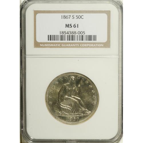 <B>1867-S 50C MS61 NGC.</B></I> A lustrous light gold example of this conditionally rare San Francisco issue. A few peripheral stars and dentils are soft, but the overall strike is good, and there are surprisingly few abrasions. Struck from prominently clashed dies. Census: 8 in 61, 16 finer (1/07).<BR><BR><b>Shipping:</b> Coins & Currency (<a target="_blank" href="http://www.heritageauctions.com/common/shipping.php">view shipping information</a>)