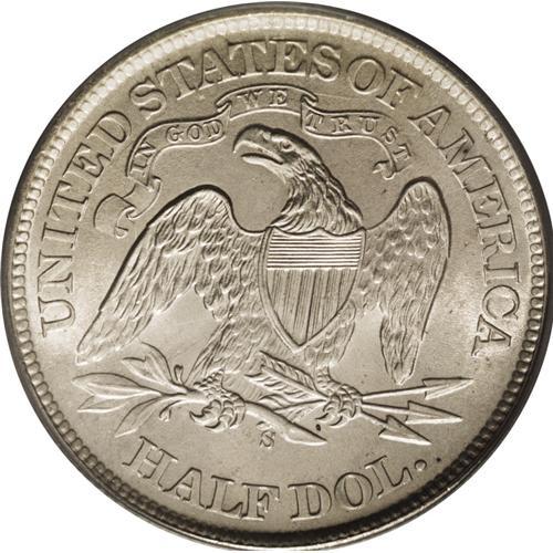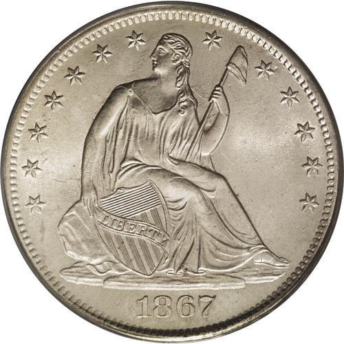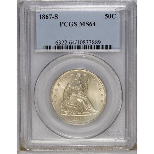 <B>1867-S 50C MS64 PCGS.</B></I> This is an unlisted variety in Wiley-Bugert. Repunching is visible under the base of the 1 in the date. Recently discovered and considered rare by Dick Osburn. This is a fully struck example that is brilliant throughout. The mint luster is brightly frosted and the only noticeable interruptions in the fields are faint die clash marks.<BR><BR><b>Shipping:</b> Coin/Currency (<a target="_blank" href="http://www.heritageauctions.com/common/shipping.php">view shipping information</a>)