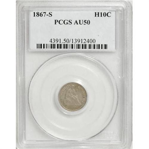 <B>1867-S H10C AU50 PCGS.</B></I> PCGS Population (7/53). NGC Census: (2/42). Mintage: 120,000. Numismedia Wsl. Price for NGC/PCGS coin in AU50: $208. (#4391)<BR><BR><B>Coin Engraver:</B> Christian Gobrecht<BR><BR><b>Shipping:</b> Coins & Currency (<a target="_blank" href="http://www.heritageauctions.com/common/shipping.php">view shipping information</a>)