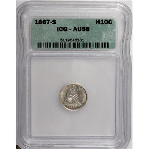 <B>1867-S H10C AU58 ICG.</B></I> NGC Census: (2/36). PCGS Population (4/49). Mintage: 120,000. Numismedia Wsl. Price for NGC/PCGS coin in AU55: $250. (#4391)<BR><BR><B>Coin Engraver:</B> Christian Gobrecht<BR><BR><b>Shipping:</b> Coins & Currency (<a target="_blank" href="http://www.heritageauctions.com/common/shipping.php">view shipping information</a>)