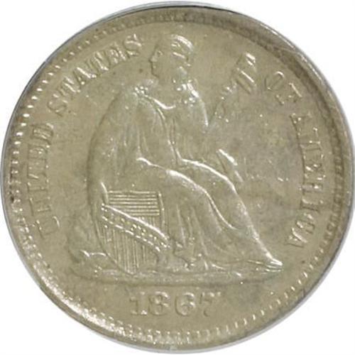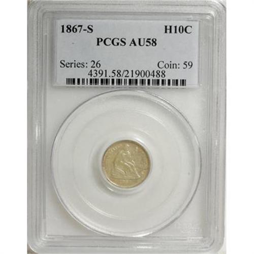 <B>1867-S H10C AU58 PCGS.</B></I> PCGS Population (4/43). NGC Census: (6/33). Mintage: 120,000. Numismedia Wsl. Price for NGC/PCGS coin in AU58: $275. (#4391)<BR><BR><B>Coin Engraver:</B> Christian Gobrecht<BR><BR><b>Shipping:</b> Coins & Currency (<a target="_blank" href="http://www.heritageauctions.com/common/shipping.php">view shipping information</a>)