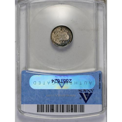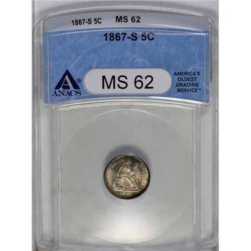 <B>1867-S<H10C> MS62 ANACS.</B></I> This better date half dime exhibits russet and cobalt-blue toning. The strike is pinpoint-sharp except for the top half of the mintmark. The lustrous surfaces are free from detectable abrasions.