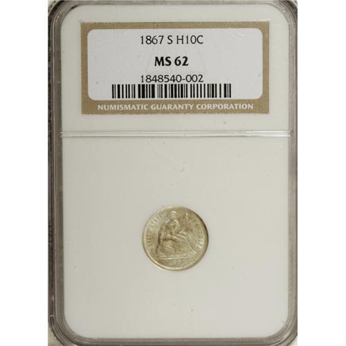 1867-S H10C MS62 NGC. This low mintage half dime has p