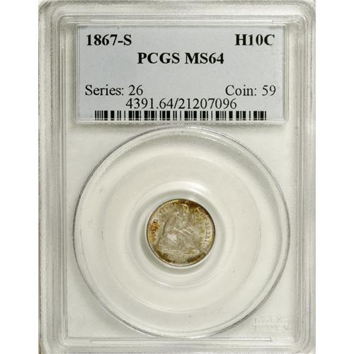 <B>1867-S H10C MS64 PCGS.</B></I> Choice and well struck, one of just 120,000 pieces minted. The lustrous centers are silver-gray, and patches of auburn and gold adorn the periphery. Population: 11 in 64, 4 finer (12/06).<BR><BR><b>Shipping:</b> Coin/Currency (<a target="_blank" href="http://www.heritageauctions.com/common/shipping.php">view shipping information</a>)