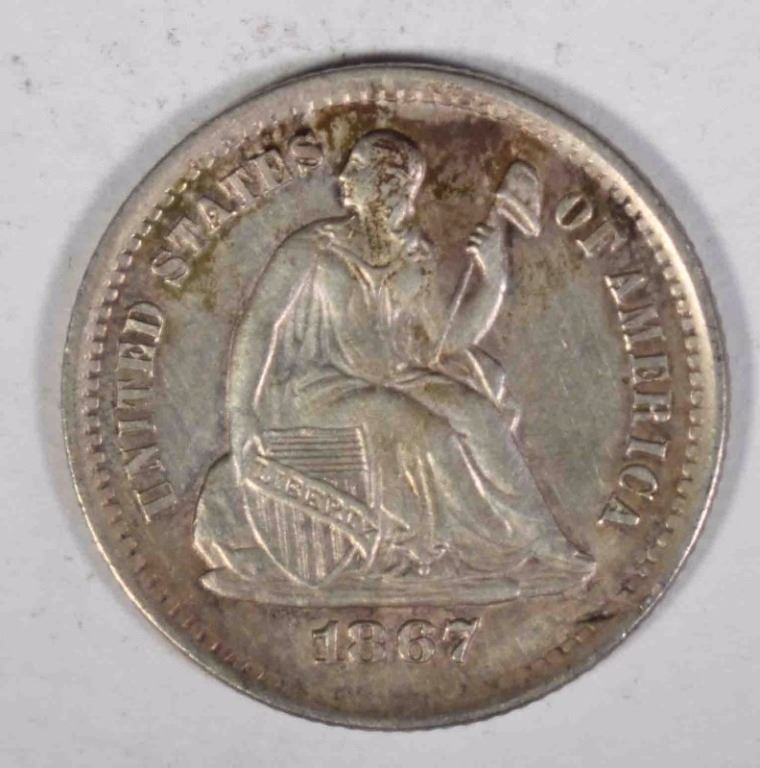 1867-S SEATED LIBERTY HALF DIME CH BU RARE DATE ESTIMATE $800 - $850.