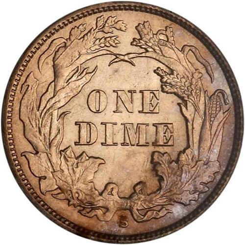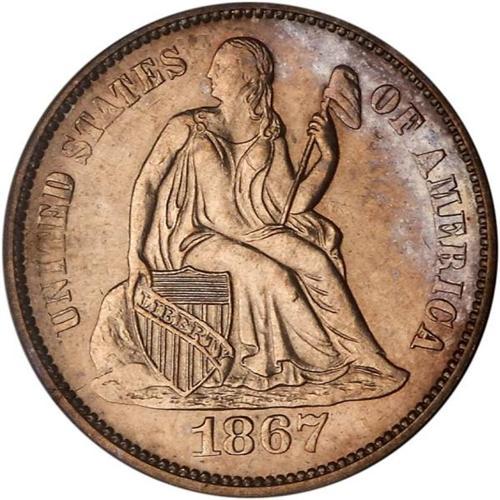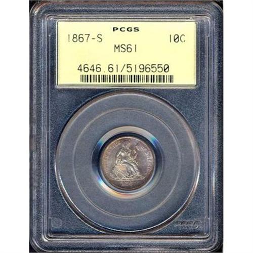 <b>1867-S Liberty Seated Dime. PCGS graded MS61.</b> With lustrous, attractively toned surfaces and needle sharp striking definition in virtually all areas, it is little wonder that this handsome piece is certified as a Mint State representative of this low mintage (140,000 pieces) date. The 1867-S heavily circulated in the Western region of the country. The otherwise silver-gray features reveal a few isolated dabs of color on both sides. The 1867-S is similar in rarity to the 1866-S seated dime <b>(PCGS # 4646)</b>