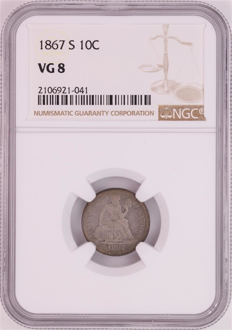 One 1867-S Seated Liberty Dime Coin NGC VG8. NGC Certified.