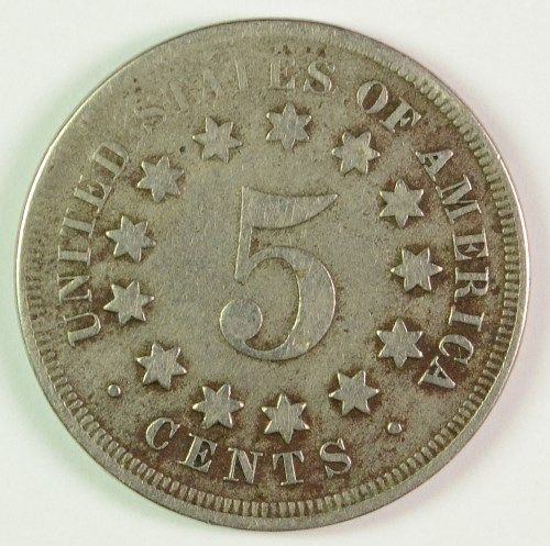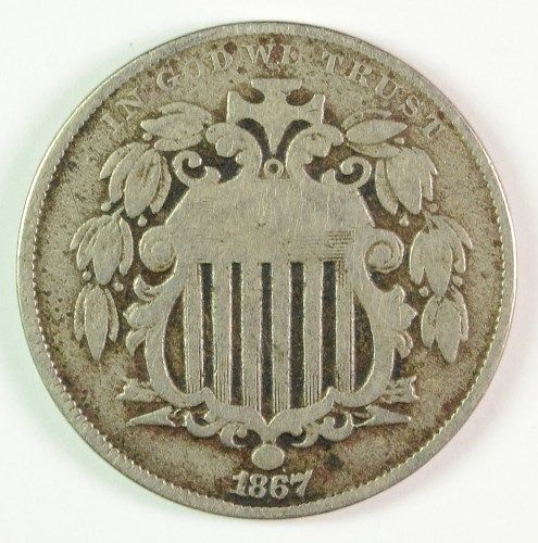 1867 SHIELD NICKEL, NO RAYS, VG/F NICE COIN