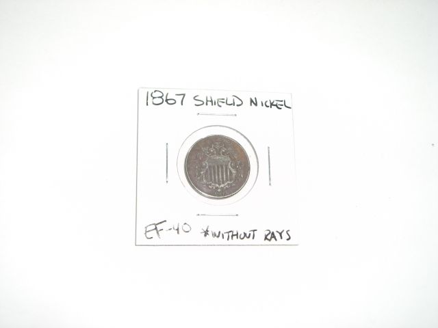1867 SHIELD NICKEL "WITHOUT RAYS" *RARE EXTRA FINE-40 HIGH GRADE*!! ***Coin, Currency & All Items Listed in this auction - Grades, Conditions and Values are not Safe Deposit Coins LLC Responsibilty. Grades, Condition and Values are determined by Consigner(s) & Buyers ONLY***