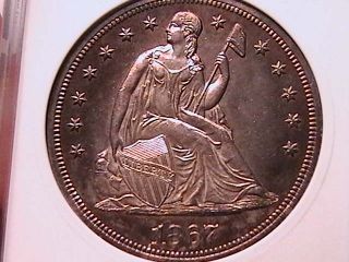 1867 Seated Dollar Pf63 ANACS. A sensational coin. The blend of golds in the lustre, lighter in the centers and a deeper at the rims, is perfectly blended for color and eye appeal. With the bold proof strike and beautiful surfaces,total proof mintage for this year was a mere 625 coins.