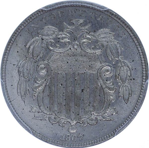 1867 Shield Nickel. No rays. PCGS graded MS-64 PCGS # 3794 .