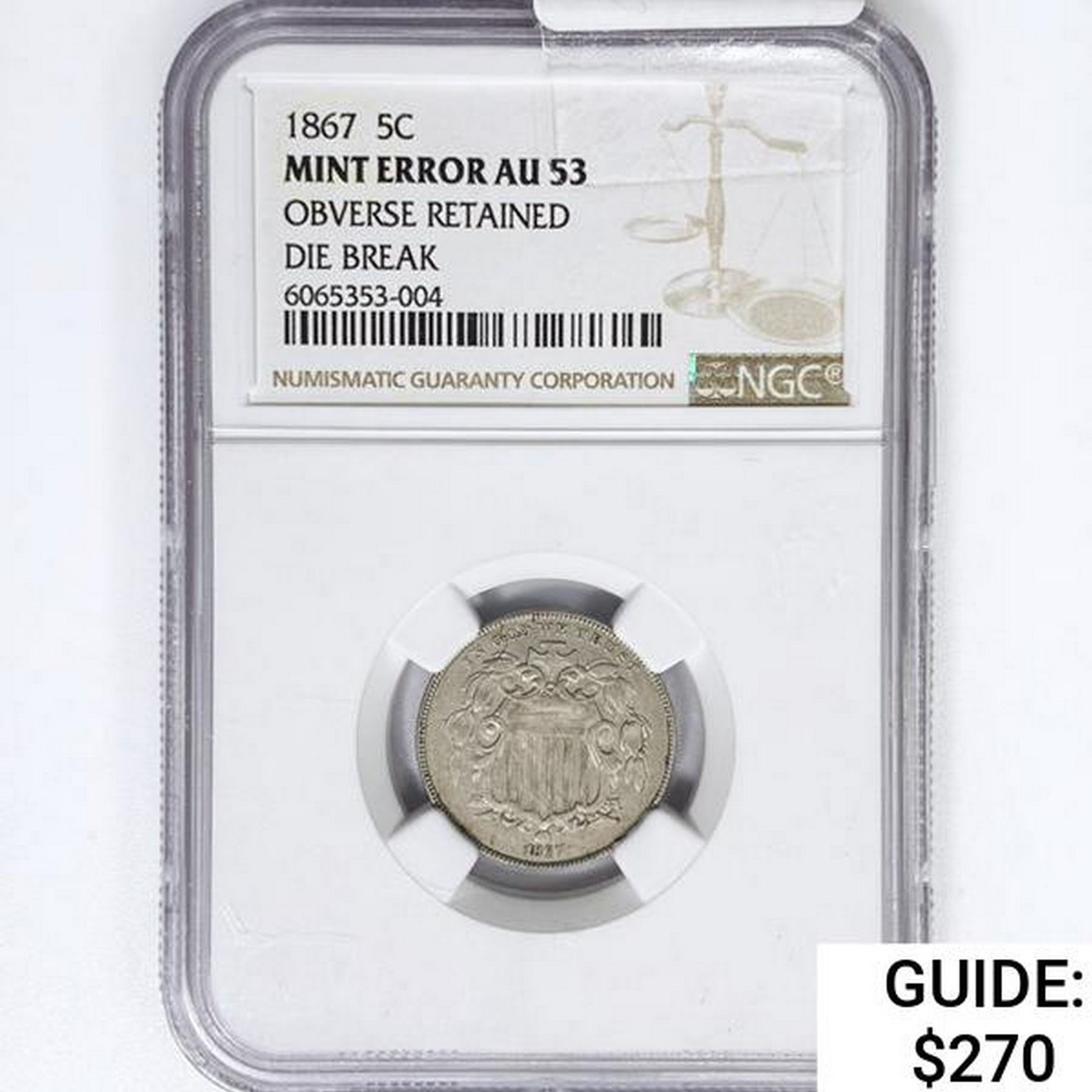 1867 Shield Nickel NGC AU53 OBV Retained Die Break