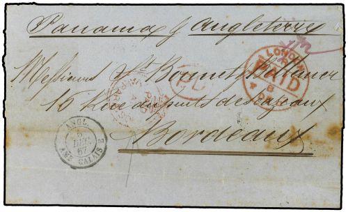 1867 Stampless envelope to BORDEAUX cancelled by crown PAID at Valparaiso (SG CC1) in red with oval P.D. routed via London with French entry cachet.