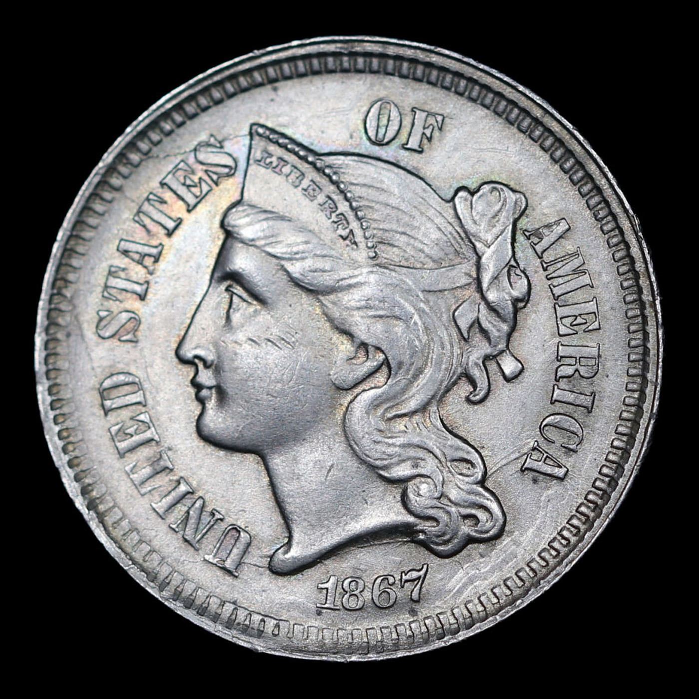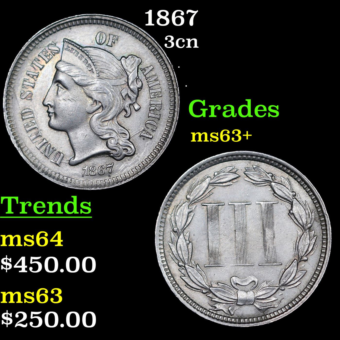 1867 Three Cent Copper Nickel 3cn Grades Select+ Unc.