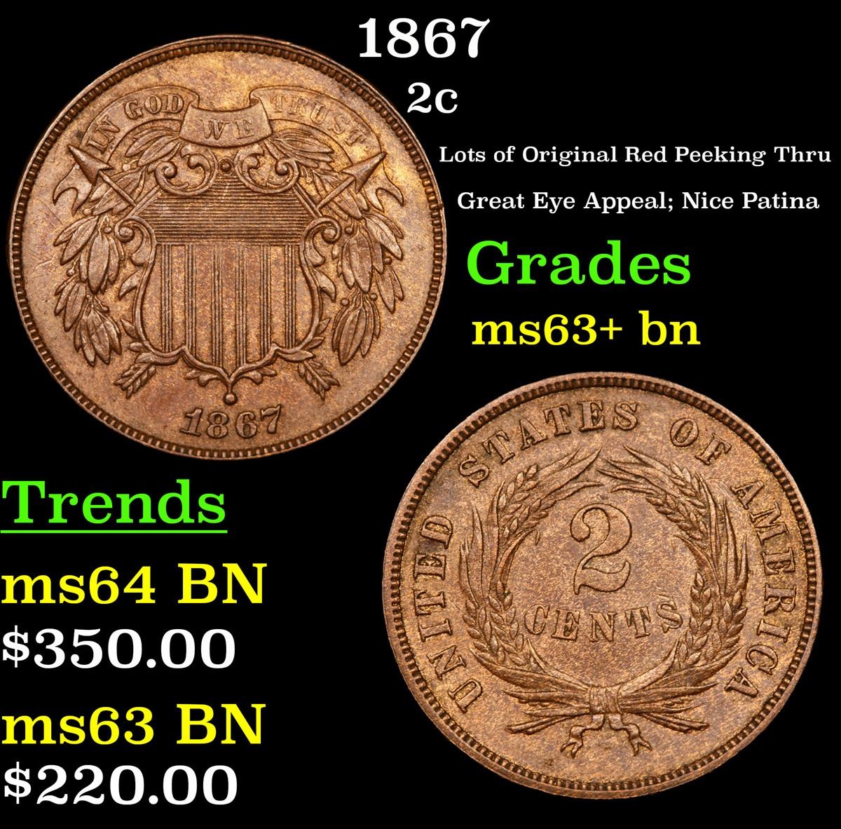 1867 Two Cent Piece 2c Grades Select+ Unc BN.