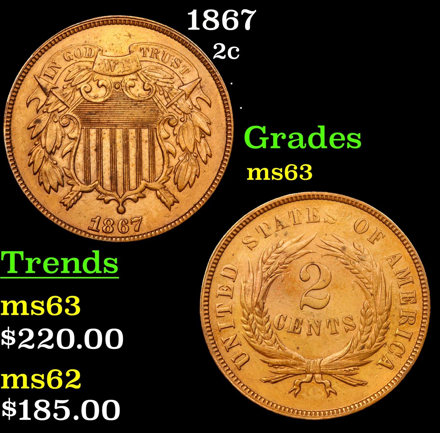 1867 Two Cent Piece 2c Grades Select Unc.