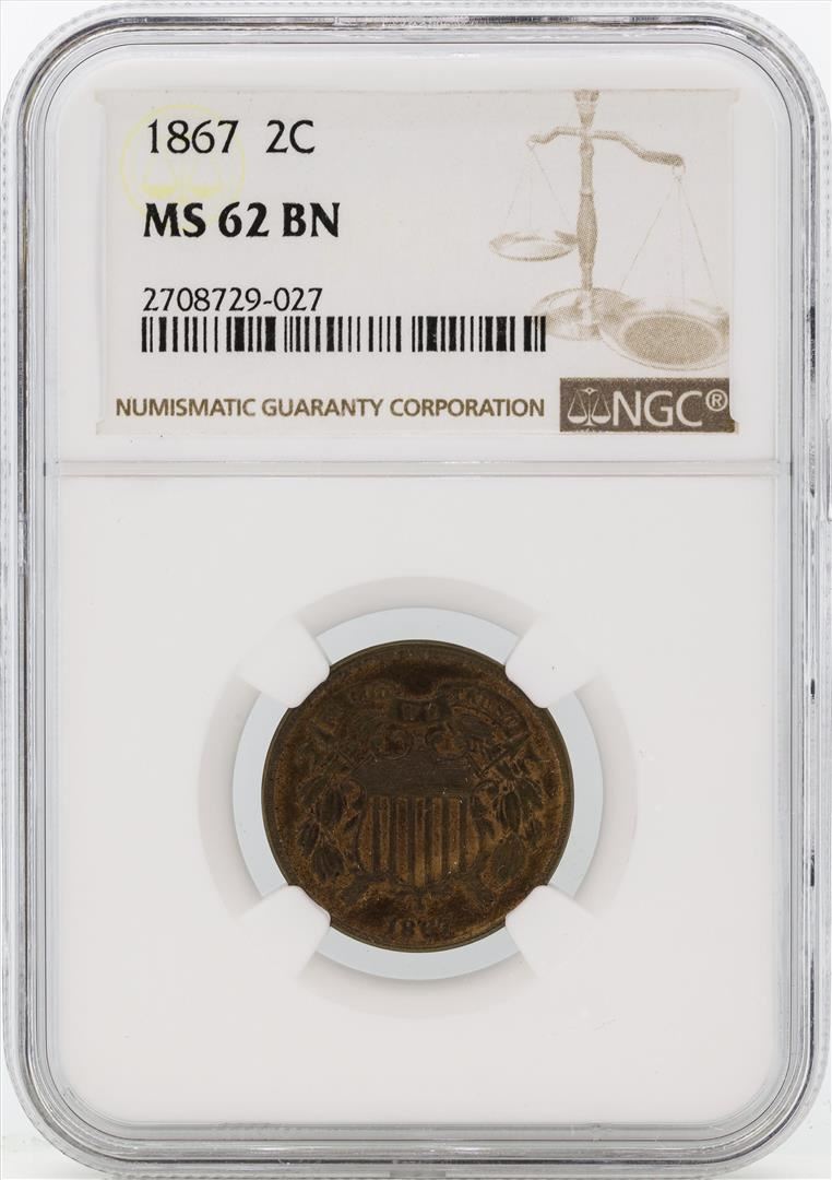 One 1867 Two Cent Piece Coin NGC MS62 BN. NGC Certified.