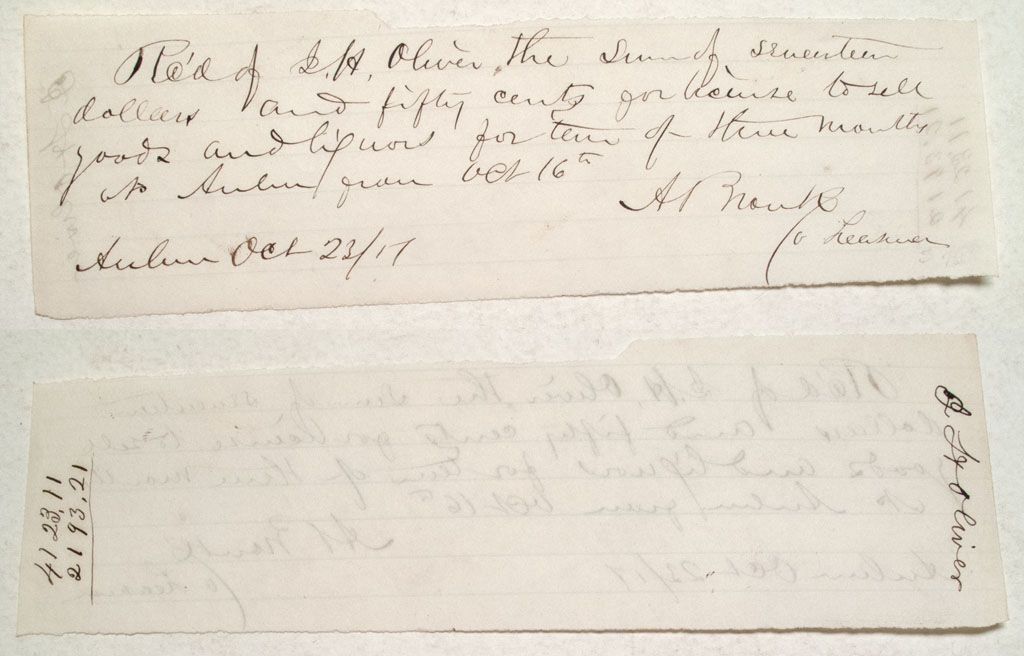 The document reads-Recd. of G.H. Oliver, the sum of seventeen dollars and fifty cents for license to sell Goods and Liquors for the term of three months from Auburn ,Oct. 16th.,-Oct 21/?(6)7