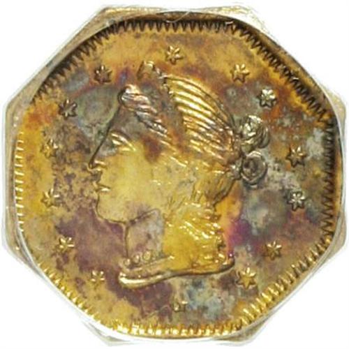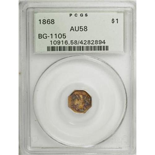 <B>1868 $1 Liberty Octagonal 1 Dollar, BG-1105, High R.4, AU58 PCGS.</B></I> . PCGS Population (2/34). NGC Census: (0/3). (#10916)<BR><BR><b>Shipping:</b> Coins & Currency (<a target="_blank" href="http://www.heritageauctions.com/common/shipping.php">view shipping information</a>)