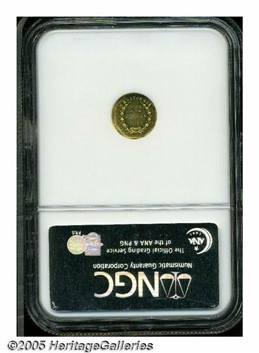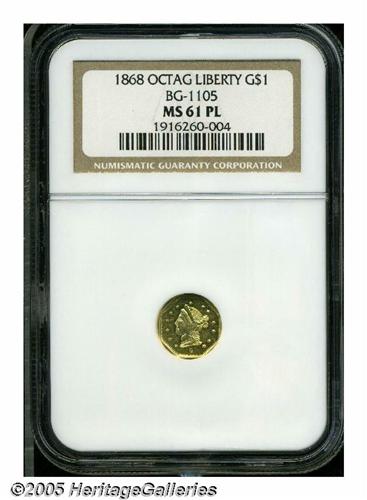 <B>1868<$1> Liberty Octagonal 1 Dollar, BG-1105, High R.4, MS61 Prooflike NGC.</B></I> This crisply struck canary-gold piece has flashy fields and a few wispy hairlines on each side. Tiny air bubbles are noted beneath the gold plate, as made and similar to that seen on circa-1983 U.S. Cents.
