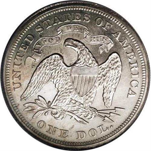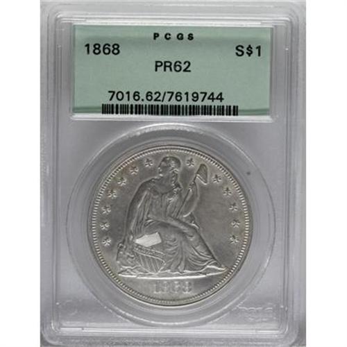 <B>1868 $1 PR62 PCGS.</B></I> This precisely struck specimen has milk-gray and pale gold toning. Much nicer than customary for the PR62 level, since the fields have only the faintest hairlines. The 1 in the date is lightly repunched, and STATES OF is minutely die doubled toward the rim. Only 600 proofs were struck. Certified in a green label holder.<BR><I>From The Vanek Collection.</B></I><BR><BR><b>Shipping:</b> Coins & Currency (<a target="_blank" href="http://www.heritageauctions.com/common/shipping.php">view shipping information</a>)