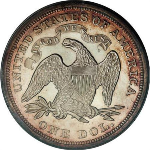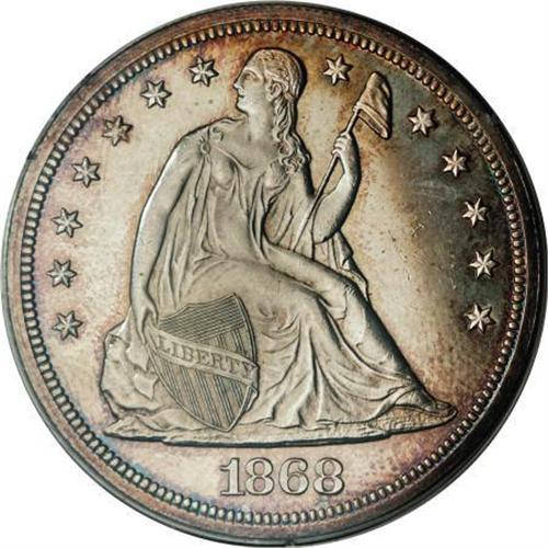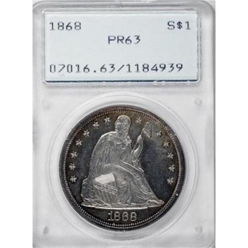 <B>1868 $1 PR63 PCGS.</B></I> Struck with unmistakable proof sharpness across both sides, this piece shows doubling along the right border of Liberty's shield, and repunching on the flag and along the base of 1 in the date. Attractive cobalt-blue, russet, and golden-brown peripheral toning appears on both sides. A few light handling marks occur on the obverse, and wispy hairlines are seen in the obverse and reverse fields. Housed in a first-generation holder from PCGS. Just 600 proofs were struck.<BR><BR><B>Coin Engraver:</B> Christian Gobrecht<BR><BR><b>Shipping:</b> Coins & Currency (<a target="_blank" href="http://www.heritageauctions.com/common/shipping.php">view shipping information</a>)
