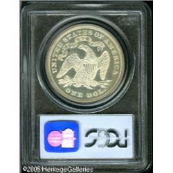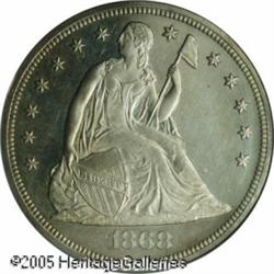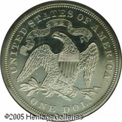 <B>1868<img border='0' src='http://www.heritagecoins.com/images/star.gif' width=10 height=10>$1 PR64 Cameo PCGS.</B></I> A lovely example of this post-Civil War issue (some would say the Civil War was still being fought) with brilliant mirrored fields and lustrous devices, all beneath a faint wash of champagne toning. A few faint hairlines limit the grade and keep this away from the Gem quality grade level. Population: 10 in 64, 2 finer (1/05). Lot:7408