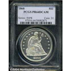 <table><tbody><tr><td><table> <TR><TD width="100%"><TABLE cellSpacing=1 cellPadding=3 width="100%" border=0><TBODY><TR><TD width="100%" bgColor=#79735c><FONT face=arial color=#ffffff size=3><B>Description</B> </FONT></TD></TR><TR><TD width="100%" bgColor=#ffffff><FONT face=arial size=2><B>1868 $1 PR64 Deep Cameo PCGS.</B></I> A high-end coin for the grade, the watery fields do not reveal any individually distracting hairlines. Both sides are also free of noticeable contact marks, and the devices are fully impressed, as one would expect for a specimen striking. Both sides exhibit a bright, generally untoned appearance allowing the remarkable cameo effect to be fully appreciated. </FONT></TD></TR></TBODY></TABLE></TD></TR></TBODY></TABLE><BR><A name=PricesRealized></A><TABLE cellSpacing=0 cellPadding=0 width="100%" bgColor=#000000 border=0><TBODY><TR><TD width="100%"><TABLE cellSpacing=1 cellPadding=3 width="100%" border=0><TBODY><TR><TD width="100%" bgColor=#79735c><A name=PR><FONT face=arial color=#ffffff size=3><B>Previous Prices from Heritage Auctions</B> </FONT></A></TD></TR><TR><TD bgColor=#f6f6ed>No Prior Data Recorded </TD></TR><TR><TD bgColor=#ffffff><FONT face=arial size=1 ?>PLEASE NOTE: All prices realized reflect the final hammer price PLUS the buyer's premium in auctions that charge a buyer's premium. Each item has a notation at the top of the listing indicating whether that lot included a buyer's premium. Example: A item that sells with a final hammer price of $100 and a 20% buyer's premium will display with a price realized of $120. All information listed is intended to be as accurate as possible, but errors are possible. Please use this guide carefully and inform us of any inaccuracies. </FONT></TD></TR></TBODY></TABLE></TD></TR></TBODY></TABLE><BR><TABLE cellSpacing=0 cellPadding=0 width="100%" bgColor=#000000 border=0><TBODY><TR><TD width="100%"><TABLE cellSpacing=1 cellPadding=3 width="100%" border=0><TBODY><TR><TD width="100%" bgColor=#79735c colSpan=6><FONT face=arial color=#ffffff size=3><B>Price Guide*</B> </FONT></TD></TR><TR bgColor=#f6f6ed><TD align=middle><B>Grade</B> </TD><TD align=middle><B>Coin World<BR>(Trends)</B> </TD><TD align=middle><B>Numismedia<BR>Retail</B> </TD><TD align=middle><B>Numismedia<BR>Wholesale</B> </TD><TD align=middle><B>Coin<BR>Universe</B> </TD><TD align=middle><B>Heritage<BR>Value Index</B> </TD></TR><TR bgColor=#ffffff><TD align=middle>63</TD><TD align=right>---</TD><TD align=right>---</TD><TD align=right>---</TD><TD align=right>---</TD><TD align=right>$2,016.00</TD></TR><TR style="FONT-WEIGHT: bold" bgColor=#cccfdd><TD align=middle>64</TD><TD align=right>---</TD><TD align=right>---</TD><TD align=right>---</TD><TD align=right>---</TD><TD align=right>$4,050.00</TD></TR><TR bgColor=#ffffff><TD align=middle>65</TD><TD align=right>---</TD><TD align=right>---</TD><TD align=right>---</TD><TD align=right>---</TD><TD align=right>$9,000.00</TD></TR><TR bgColor=#ffffff><TD colSpan=6><FONT size=1>*All information listed is intended to be as accurate as possible, but errors are possible. No item may be returned or refused based on this information which is provided as a service to our customers. You should contact each pricing source directly to determine the accuracy of this information. </FONT></TD></TR></TBODY></TABLE></TD></TR></TBODY></TABLE><BR><TABLE cellSpacing=0 cellPadding=0 width="100%" bgColor=#000000 border=0><TBODY><TR><TD width="100%"><TABLE cellSpacing=1 cellPadding=3 width="100%" border=0><TBODY><TR><TD width="100%" bgColor=#79735c><FONT face=arial color=#ffffff size=3><B>Population Guide</B> </FONT></TD></TR><TR bgColor=#ffffff><TD align=middle><!-- Begin Output of Population Grid--><TABLE cellSpacing=0 cellPadding=0 width="100%" border=0><TBODY><TR><TD vAlign=center><TABLE cellSpacing=0 width="100%" border=1 cellsadding="3"><TBODY><TR><TD vAlign=center><TABLE cellSpacing=0 cellPadding=3 width="100%" border=1><TBODY><TR><TD vAlign=center align=middle bgColor=#f0f1e8 colSpan=2 <CENTER><FONT face=Arial size=2><B>PCGS Pop </B></FONT><CENTER></CENTER></TD><TD vAlign=center align=middle bgColor=#f0f1e8 colSpan=2><CENTER><FONT face=Arial size=2><B>NGC Pop</B></CENTER></FONT></TD></TR><TR><TD vAlign=center><FONT face=Arial size=2>(64)</FONT> </TD><TD vAlign=center align=right><FONT face=Arial size=2>2</FONT> </TD><TD vAlign=center><FONT face=Arial size=2>(64)</FONT> </TD><TD vAlign=center align=right><FONT face=Arial size=2>1</FONT> </TD></TR><TR><TD vAlign=center><FONT face=Arial size=2>(>64)</FONT> </TD><TD vAlign=center align=right><FONT face=Arial size=2>0</FONT> </TD><TD vAlign=center><FONT face=Arial size=2>(>64)</FONT> </TD><TD vAlign=center align=right><FONT face=Arial size=2>2</FONT> </TD></TR></TBODY></TABLE></TD></TR></TBODY></TABLE></TD></TR></TBODY></TABLE><!-- End Output of Population Grid--></TD></TR></TBODY></TABLE></TD></TR></TBODY></TABLE><BR><TABLE cellSpacing=0 cellPadding=0 width="100%" bgColor=#000000 border=0><TBODY><TR> <font color='#000000'><span style='background-color: #FFFFFF'><td bgcolor='#FFFFFE'> Important notice: Heritage usually auctions material at the rate of 200-250 lots per hour. On some occasions eBay Live bid software or the Internet may not be able to keep up with the pace of the auction. We recommend placing a realistic absentee bid now as insurance to avoid disappointment. Occasionally the auctioneer may eliminate or reject an eBay Live bid, and the auctioneer may also reopen a lot after the close of the eBay live bidding (usually because we missed an audience bid), and may reject your bid even if it shows you as the winning bidder. By bidding via eBay Live, you agree that Heritage may award the lot to another bidder at its sole discretion under the circumstances described above or any other reasonable circumstances. Since eBay bids are not shown to us until we open the lot on the floor, we treat those bids just like floor bids. In most cases the floor responds before the eBay bid is presented t