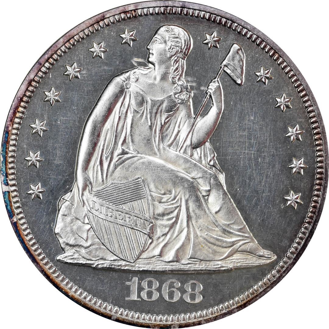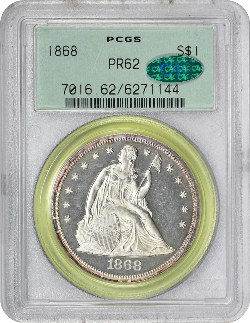 One 1868 $1 Proof Seated Liberty Silver Dollar Coin PCGS PR62 CAC OGH. PCGS Graded.