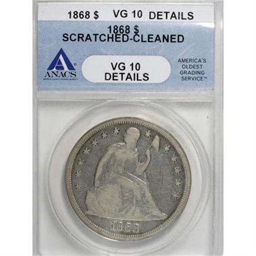<B>1868 $1 --Cleaned, Scratched--ANACS. VG10 Details.</B></I> NGC Census: (0/69). PCGS Population (1/106). Mintage: 162,100. Numismedia Wsl. Price for NGC/PCGS coin in VG10: $234. (#6961)<BR><BR><B>Coin Engraver:</B> Christian Gobrecht<BR><BR><b>Shipping:</b> Coins & Currency (<a target="_blank" href="http://www.heritageauctions.com/common/shipping.php">view shipping information</a>)