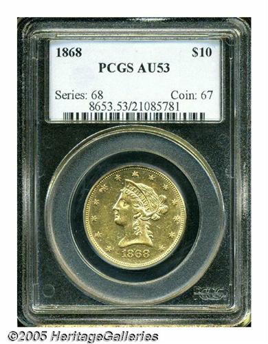 <B>1868<$10> AU53 PCGS.</B></I> A lightly worn example that is a very bright, yellow-gold color overall. Well struck, the obverse is a bit more abraded than the reverse. One of just 10,655 pieces struck and scarce in all grades.