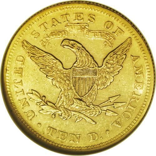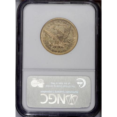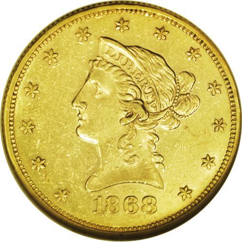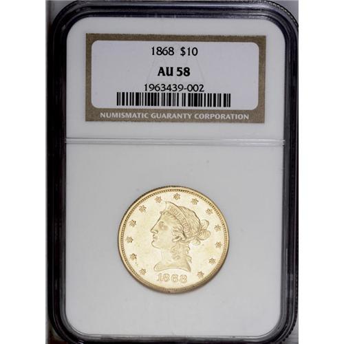 <B>1868<$10> AU58 NGC.</B></I> Mintages climbed up into the five digits for 1868, with a total of 10,630 struck for circulation. Despite the Philadelphia Mint's efforts, all apparently entered circulation as neither grading service has yet awarded any specimen of this date a grade of mint state. This particular coin is about as close and you can get, with just a whisper of rub on the highest curls of Liberty, and the surfaces show scattered handling marks expected from even the briefest time in the channels of commerce. Luster remains in the protected areas, and the color is a bright yellow-gold overall. Scattered handling marks are found with the aid of a loupe, although none are noteworthy. Census: 16 in 58, 1 finer (7/06).