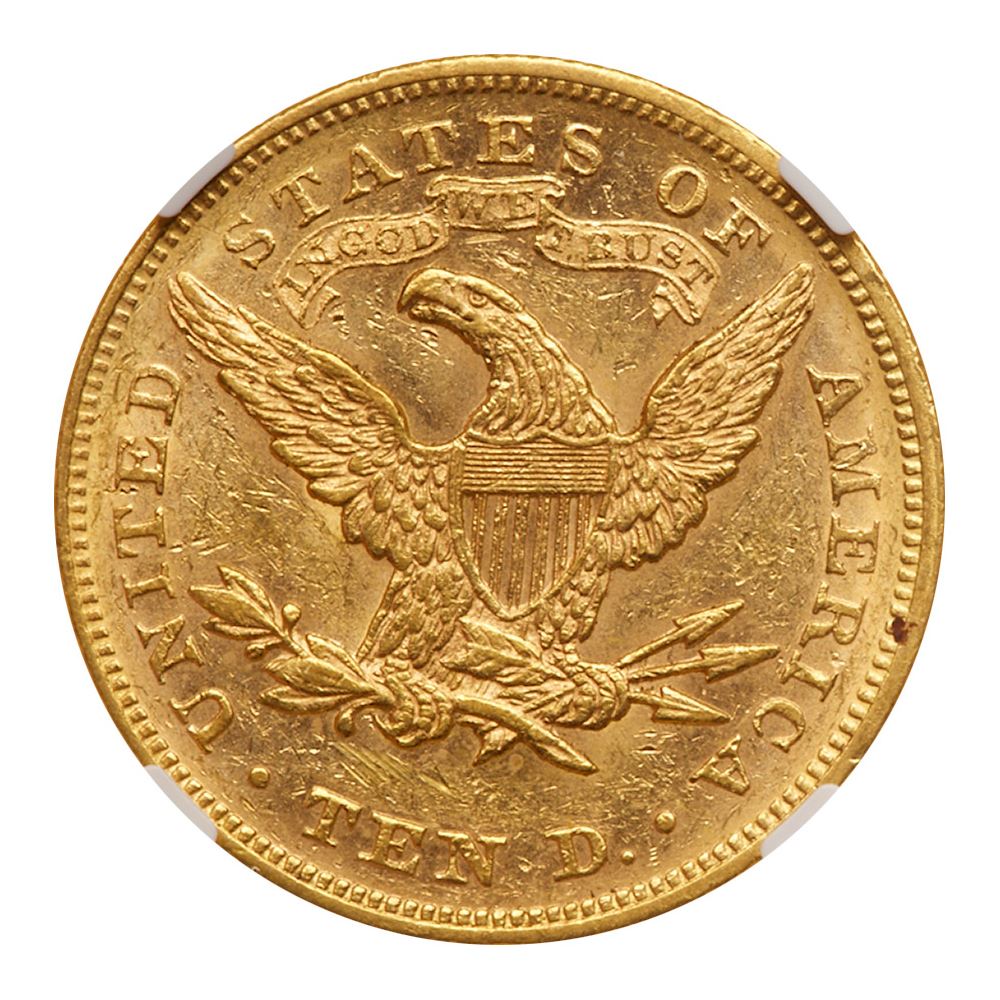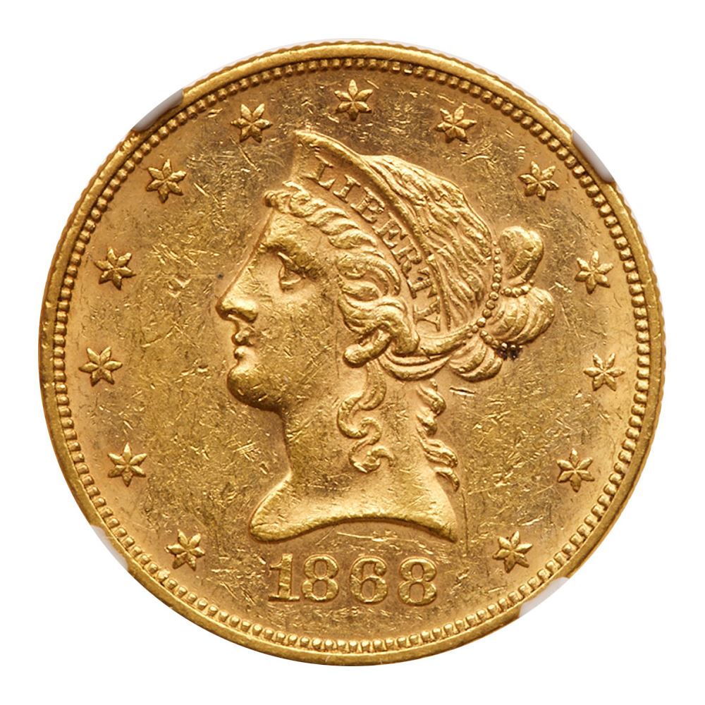 1868. NGC graded MS-61. This is a true condition rarity. For many years specialists doubted that any mint state pieces even existed for this scarce date. Then over time a few new coins trickeled out from various sources and here is one of the very few that has been certified as Mint State. A nice frosty example that shows only scattered light marks and retains much of the original appeal imparted by the dies in 1868. Only 10,630 struck. Pop 2; none finer at NGC. PCGS # 8653 Estimated Value 12,000 - UP