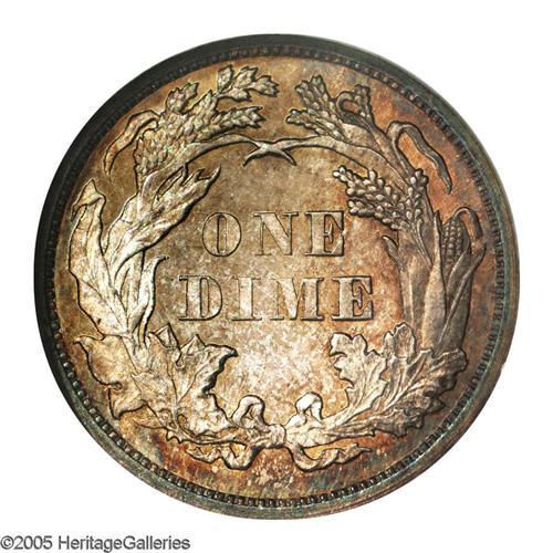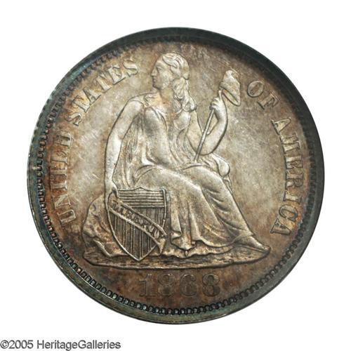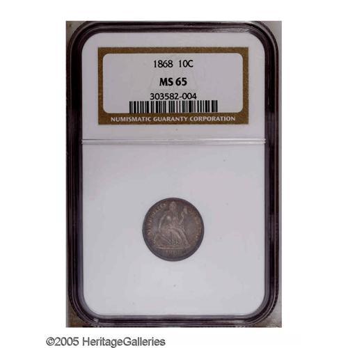 <B>1868<10C> MS65 NGC.</B></I> A moderately prooflike Gem with attractive orange-gold toning. Glimpses of aquamarine and plum color hug the borders. Well struck and carefully preserved. Not a rare date in circulated grades, but examples above basal Mint State are few and far between. Census: 8 in 65, 2 finer (11/05).