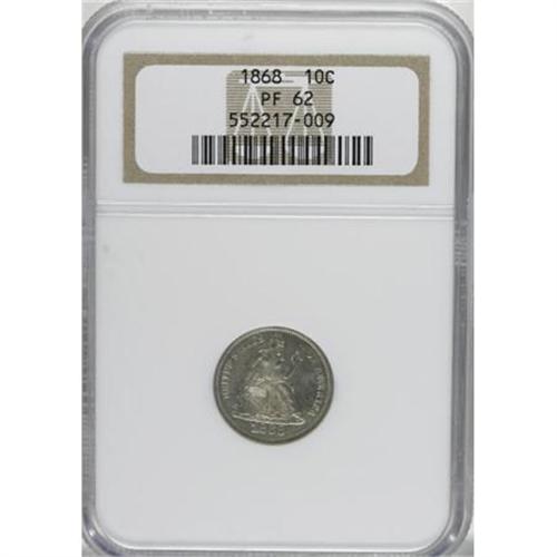 <B>1868 10C PR62 NGC.</B></I> NGC Census: (11/93). PCGS Population (25/110). Mintage: 600. Numismedia Wsl. Price for NGC/PCGS coin in PR62: $421. (#4761)<BR><BR><B>Coin Engraver:</B> Christian Gobrecht<BR><BR><b>Shipping:</b> Coins & Currency (<a target="_blank" href="http://www.heritageauctions.com/common/shipping.php">view shipping information</a>)