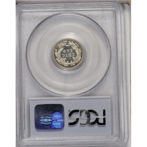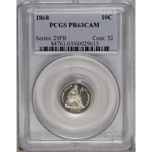 <B>1868<10C> PR63 Cameo PCGS.</B></I> An untoned and well struck coin with obvious cameo contrast. The reverse is unusually clean, while the obverse field has only a few faint hairlines. A scarce proof issue; only 600 pieces were produced, and probably less than half of this mintage has survived. Population: 4 in 63 Cameo, 8 finer (6/06).