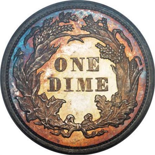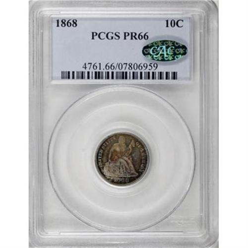 <B>1868 10C PR66 PCGS. CAC.</B></I> The semikey status of the 1864 business strikes, with a mintage of only 464,000 pieces, exerts added pressure from series collectors on the few proofs available of this date. The present piece is among the finest handful certified, both technically and aesthetically. Ice-blue peripheries on both sides frame centers of stunning sunset-orange and magenta. One of four in PR66 at PCGS, with nine finer, although NGC has graded two pieces higher (3/08).<BR><I>From The Good Humor Collection.</B></I><BR><BR><B>Coin Engraver:</B> Christian Gobrecht<BR><BR><b>Shipping:</b> Coins & Currency (<a target="_blank" href="http://www.heritageauctions.com/common/shipping.php">view shipping information</a>)