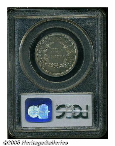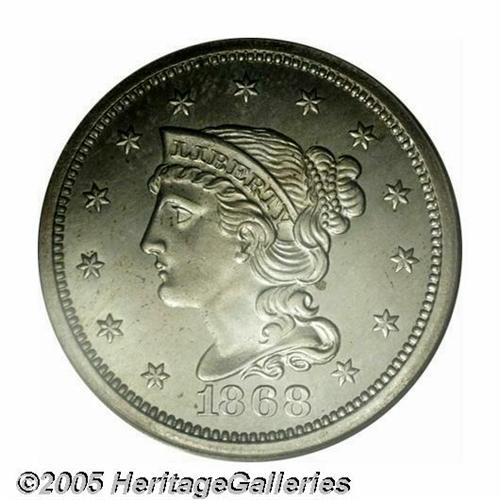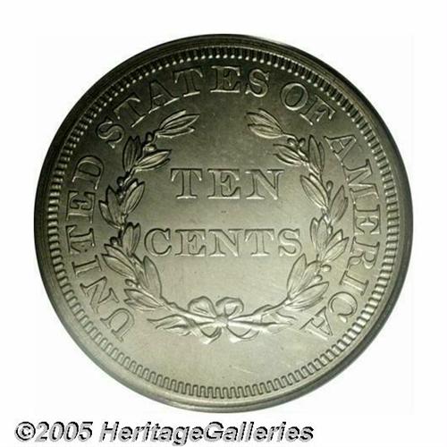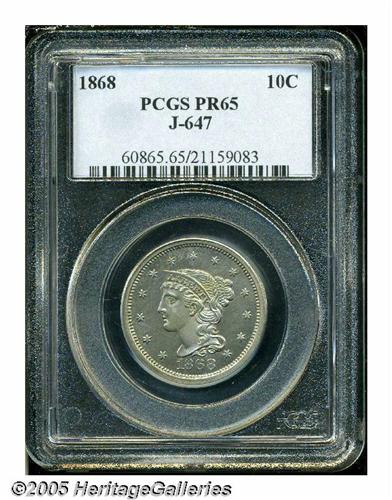 <B>1868<10C> Ten Cents, Judd-647, Pollock-720, Low R.6, PR65 PCGS.</B></I> The obverse features the almost identical design used on Large Cents from 1843 to 1857, while the reverse is similar to the Coronet Type Large Cent except the wreath is smaller and open and TEN CENTS is in the center of the wreath. The top of a stray letter, probably an A, is noted between AM in AMERICA. Struck in nickel with a plain edge. It is probable that these patterns were prepared simply to exhibit the size and weight of the suggested coin rather than to illustrate a proposed design. A few faint flyspecks are seen over the modestly reflective obverse, while numerous die striations angle across the reverse.<BR><I>From The Western Hills Collection.</B></I>
