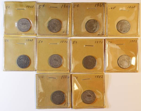 1868-1882 Shield Nickels, 10 pieces. 1868 5, 1870, 1875, 1882 3. Good to EF.