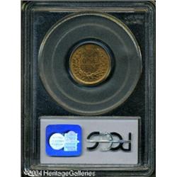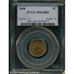 1868 1C MS64 Red PCGS. Coppery-gold surfaces are a <B>1868 1C MS64 Red PCGS.</B></I> Coppery-gold surfaces are a bit more bright and vibrant on the reverse. The devices are sharply struck, and a few flecks are scattered about, particularly on the obverse. Population: 52 in 64, 30 finer (10/04). <BR><BR><B>Important notice:</B> Heritage usually auctions material at the rate of 200-250 lots per hour. On some occasions eBay Live bid software or the Internet may not be able to keep up with the pace of the auction. We recommend placing a realistic absentee bid now as insurance to avoid disappointment. Occasionally the auctioneer may eliminate or reject an eBay Live bid, and the auctioneer may also reopen a lot after the close of the eBay live bidding (usually because we missed an audience bid), and may reject your bid even if it shows you as the winning bidder. By bidding via eBay Live, you agree that Heritage may award the lot to another bidder at its sole discretion under the circumstances described above or any other reasonable circumstances. Since eBay bids are not shown to us until we open the lot on the floor, we treat those bids just like floor bids. In most cases the floor responds before the eBay bid is presented to us, due to Internet lag time, so for consistency we have made it a policy that floor bids are always considered first over tie eBay live bids. Also please note that all Heritage lots purchased through eBay Live carry a 20% Buyer's Premium. Please make sure you read the Terms and Conditions before you bid. This lot is being auctioned in conjunction with a live floor auction by Heritage Galleries & Auctioneers. All final auction and invoice information will be supplied by Heritage Galleries & Auctioneers, and all other information should be considered preliminary. Lot:5078