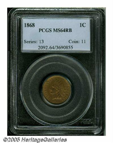 <B>1868<1C> MS64 Red and Brown PCGS.</B></I> Medium honey-gold and olive colors. A boldly struck representative that has good luster and relatively clean surfaces. The obverse rim has tiny toning spots at 6 and 10 o'clock.