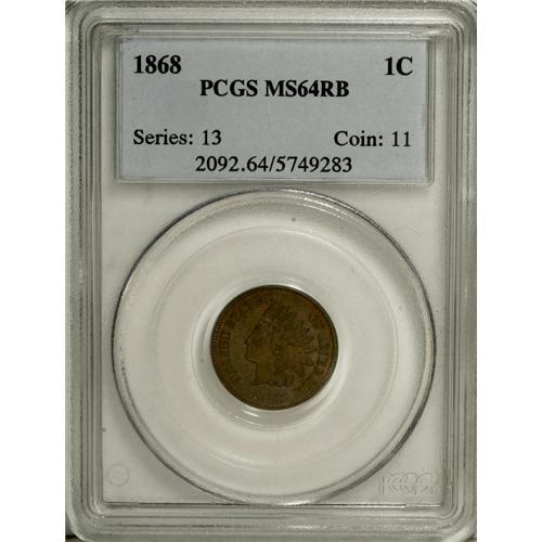 <B>1868 1C MS64 Red and Brown PCGS.</B></I> PCGS Population (156/76). NGC Census: (126/109). Mintage: 10,266,500. Numismedia Wsl. Price for NGC/PCGS coin in MS64: $492. (#2092)<BR><BR><b>Shipping:</b> Coins & Currency (<a target="_blank" href="http://www.heritageauctions.com/common/shipping.php">view shipping information</a>)