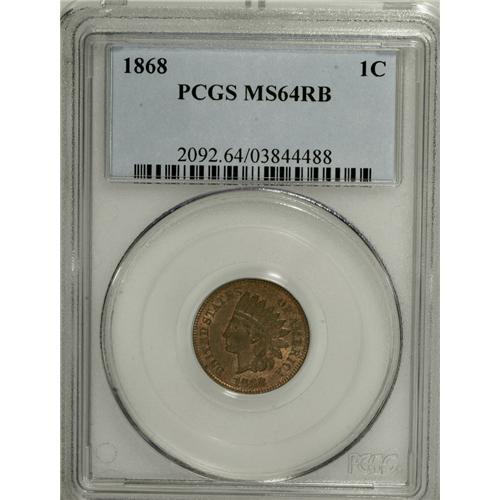 <B>1868 1C MS64 Red and Brown PCGS.</B></I> Speckled "woodgrain" patina in mellowed olive-brown color dominates on both sides. Slightly soft on the feathertips, the N in ONE, and the shield, but carefully preserved and free of distractions. An attractive Indian cent for the grade.<BR><BR><b>Shipping:</b> Coins & Currency (<a target="_blank" href="http://www.heritageauctions.com/common/shipping.php">view shipping information</a>)