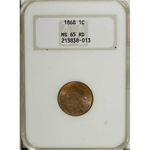 <B>1868 1C MS65 Red NGC.</B></I> A solidly struck and carefully preserved example that has mahogany and orange obverse surfaces with similar colors and peach on the reverse. Well-preserved with no marks of any note and excellent eye appeal. An attractive example of this Reconstruction issue, which consisted of slightly under 10.3 million pieces. Census: 15 in 65 Red, 3 finer (6/07).<I><BR>From The Santa Fe Collection.</B></I><BR><BR><B>Coin Engraver:</B> James B. Longacre<BR><BR><b>Shipping:</b> Coins & Currency (<a target="_blank" href="http://www.heritageauctions.com/common/shipping.php">view shipping information</a>\)