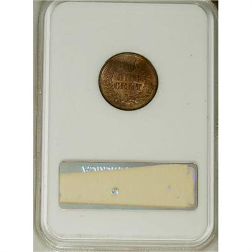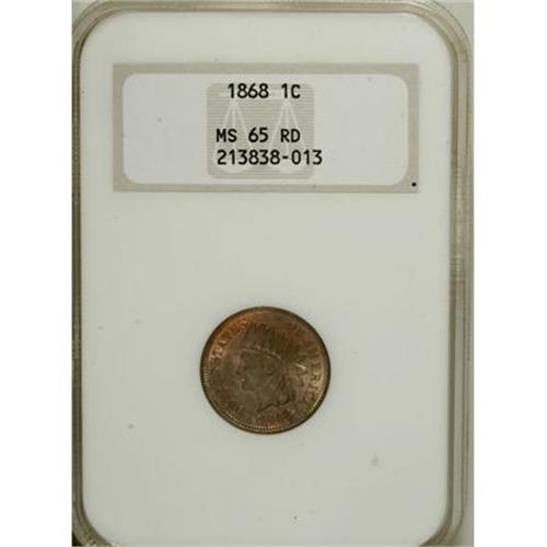 <B>1868 1C MS65 Red NGC. CAC.</B></I> Lustrous and well struck with a remarkably carbon-free and unabraded appearance. Beautiful fire-red, gold, and olive hues further ensure the eye appeal. Rare in such exemplary condition, and housed in a prior generation holder. Census: 15 in 65 Red, 3 finer (10/07).<BR><I>From The Santa Fe Collection, Part Two.</B></I><BR><BR><B>Coin Engraver:</B> James B. Longacre<BR><BR><b>Shipping:</b> Coins & Currency (<a target="_blank" href="http://www.heritageauctions.com/common/shipping.php">view shipping information</a>)