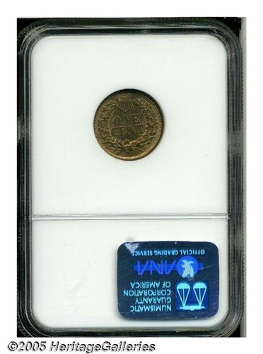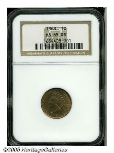 <B>1868<1C> MS65 Red and Brown NGC.</B></I> Boldly struck throughout, with slight typical weakness on the upper feathertips of the headdress, and rich, variegated patina, with moderate carbon on the obverse.