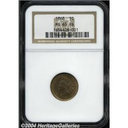 <B>1868<1C> MS65 Red and Brown NGC.</B></I> Boldly struck throughout, with slight typical weakness on the upper feathertips of the headdress, and rich, variegated patina, with moderate carbon on the obverse. <BR><BR><B>Important notice:</B> Heritage usually auctions material at the rate of 200-250 lots per hour. On some occasions eBay Live bid software or the Internet may not be able to keep up with the pace of the auction. We recommend placing a realistic absentee bid now as insurance to avoid disappointment. Occasionally the auctioneer may eliminate or reject an eBay Live bid, and the auctioneer may also reopen a lot after the close of the eBay live bidding (usually because we missed an audience bid), and may reject your bid even if it shows you as the winning bidder. By bidding via eBay Live, you agree that Heritage may award the lot to another bidder at its sole discretion under the circumstances described above or any other reasonable circumstances. Since eBay bids are not shown to us until we open the lot on the floor, we treat those bids just like floor bids. In most cases the floor responds before the eBay bid is presented to us, due to Internet lag time, so for consistency we have made it a policy that floor bids are always considered first over tie eBay live bids. Also please note that all Heritage lots purchased through eBay Live carry a 20% Buyer's Premium. Please make sure you read the Terms and Conditions before you bid. </span></font></tr></table></td></tr></table>