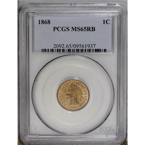 <B>1868<1C> MS65 Red and Brown PCGS.</B></I> Mellowed gold surfaces are devoid of mentionable abrasions or unsightly spots. Nice definition is apparent on the design features, including the diamonds and most of the feather tips. Population: 63 in 65, 4 finer (3/06). <BR><BR><B>Important notice:</B> Heritage usually auctions material at the rate of 200-250 lots per hour. On some occasions eBay Live bid software or the Internet may not be able to keep up with the pace of the auction. We recommend placing a realistic absentee bid now as insurance to avoid disappointment. Occasionally the auctioneer may eliminate or reject an eBay Live bid, and the auctioneer may also reopen a lot after the close of the eBay live bidding (usually because we missed an audience bid), and may reject your bid even if it shows you as the winning bidder. By bidding via eBay Live, you agree that Heritage may award the lot to another bidder at its sole discretion under the circumstances described above or any other reasonable circumstances. Since eBay bids are not shown to us until we open the lot on the floor, we treat those bids just like floor bids. In most cases the floor responds before the eBay bid is presented to us, due to Internet lag time, so for consistency we have made it a policy that floor bids are always considered first over tie eBay live bids. Also please note that all Heritage lots purchased through eBay Live carry a 20% Buyer's Premium. Please make sure you read the Terms and Conditions before you bid. This lot is being auctioned in conjunction with a live floor auction by Heritage Galleries & Auctioneers. All final auction and invoice information will be supplied by Heritage Galleries & Auctioneers, and all other information should be considered preliminary. Lot:380 <BR><BR><B>Winning Notification and Billing:</B> After the FINAL session in this auction is complete, Heritage will send e-mail and snail mail invoices. This process normally takes several days. All final auction and invoice information will be supplied by Heritage Galleries & Auctioneers, and all other information should be considered preliminary. <BR><BR>This auction will be conducted on a live auction floor and over the Internet through eBay Live. If you choose to place an absentee bid, please take a moment to <font color='#0000ff'><u><a href='http://pages.ebay.com/liveauctions/help/before/laabsentee.html'>learn how eBay Live absentee bidding works</a></u></font><font color='#000000'>
